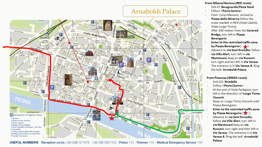 Exit A7 Bereguardo/Pavia Nord, Follow “Pavia Centro”. Arrived to Piazza della Minerva (with a big statue) turn on the right and follow Viale della Libertà. You will see the Ticino River, turn on the left. After 100 mt from the Covered Bridge, turn left in Piazza Berengario. Advance to via Sant Ennodio, follow via Villa Glori, turn left in via Mantovani, keep on via Rusconi, turn right and ten left in Via Varese.